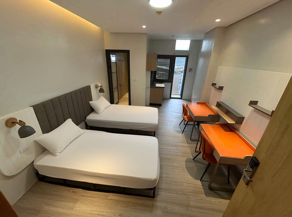 الغرفة المزدوجة أكبر من الغرفة الفردية من النوع A، وهي واسعة بما يكفي ليستخدمها شخصان بكل راحة.